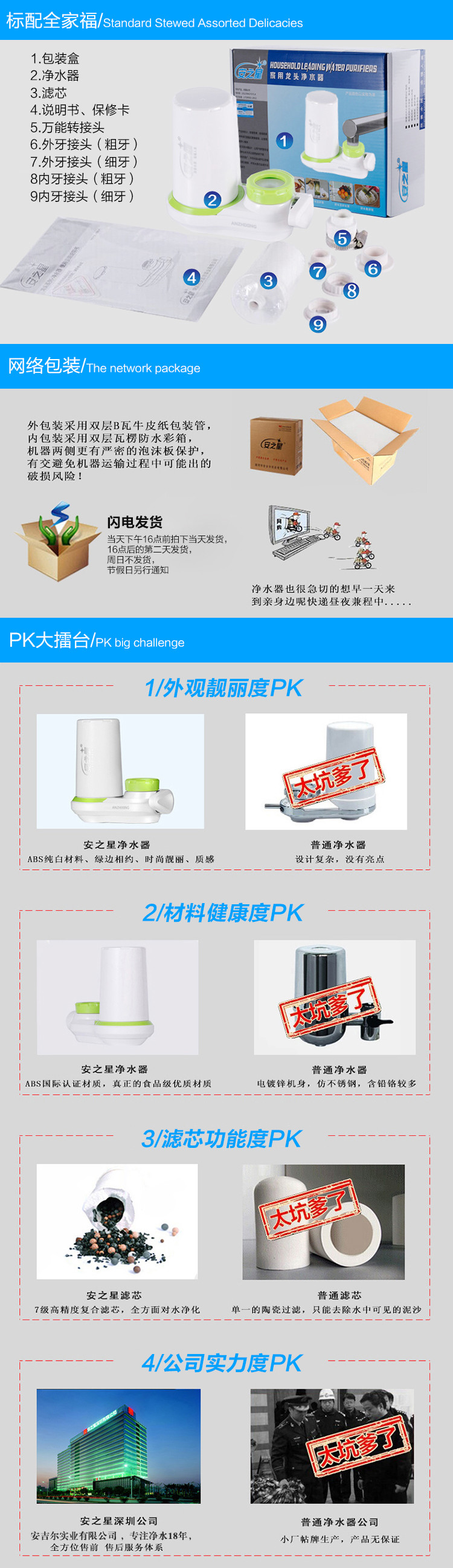 新款特价体验,0风险拍下就赠运费险,全国包邮。功能:全新7层过滤技术,更有效改善水质,拦截水中的重金属,铁锈,红虫,泥沙等大于0.1微米的有害杂质。新品特价体验仅售78元,全ABS材质纯物理过滤 安全放心,安装简便。厨房水龙头净水器